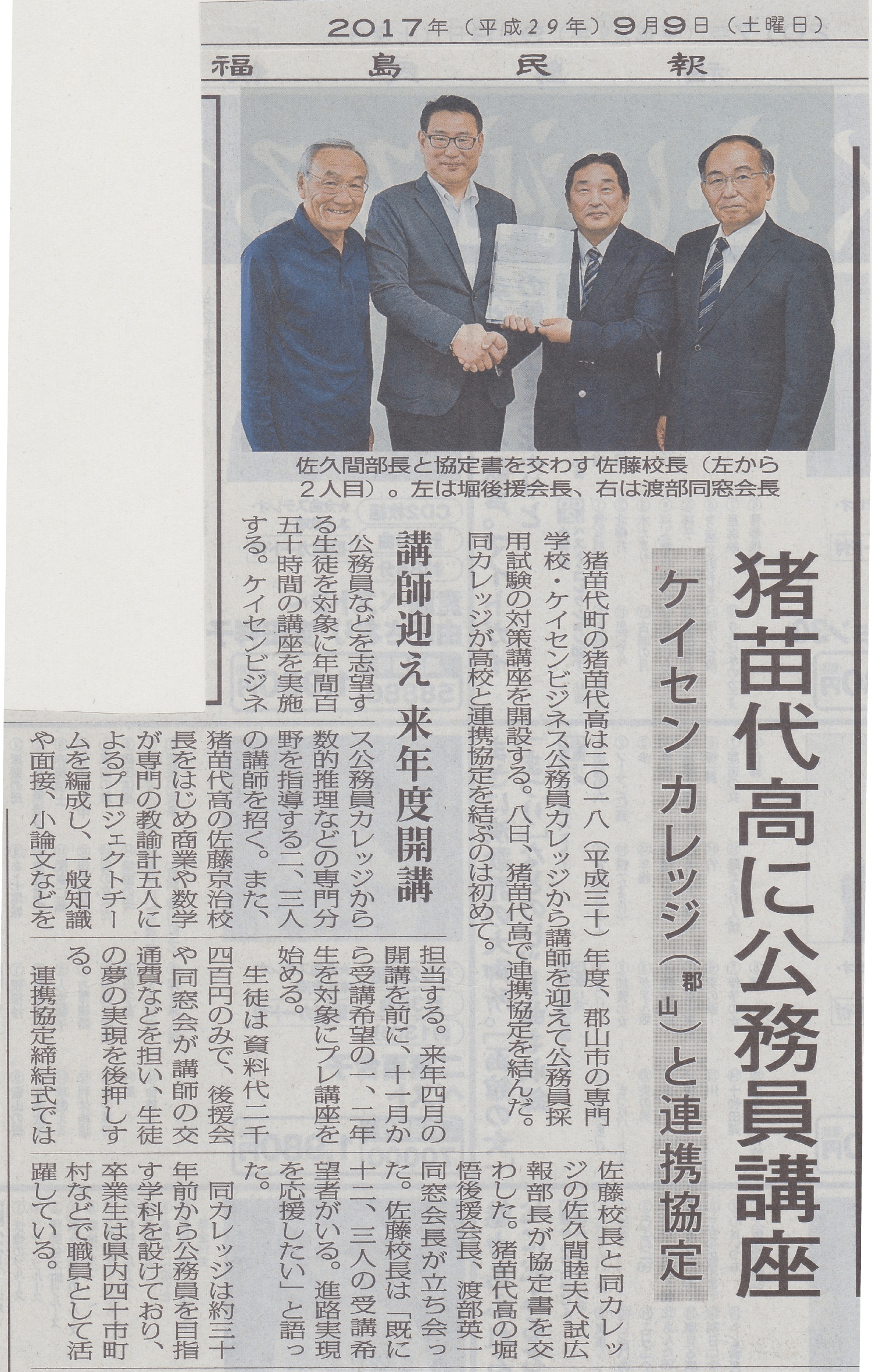 公務員現役合格を目指して!! 2017年9月11日 13時31分 保護者の方へ 本校は平成30年度から、公務員現役合格を目指してケイセンビジネス公務員カレッジと連携して、公務員講座を開設します。公務員試験は非常に狭き門ですが、生徒の進路希望実現を目指して、頑張ります。ご期待ください。 ( ↑ 上の画像をクリックすると拡大できます。)