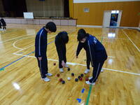 多くの生徒は初めての体験であったため、はじめはボールを転がす方向や力加減が難しく、苦戦していました。しかし、徐々にコツを掴み狙い通りに投げることができるようになりました。ゲームでは、チームの仲間と作戦を考えたり、互いに指示を出したりしながら相手チームと競い合っていました。大いに盛り上がり、大きな歓声や笑い声が体育館に響き渡っていました。「またやってみたい」、「力加減が難しかったが、とても楽しかった」、「授業にも取り入れてほしい」との感想が聞かれ、とても楽しい時間となったようです。